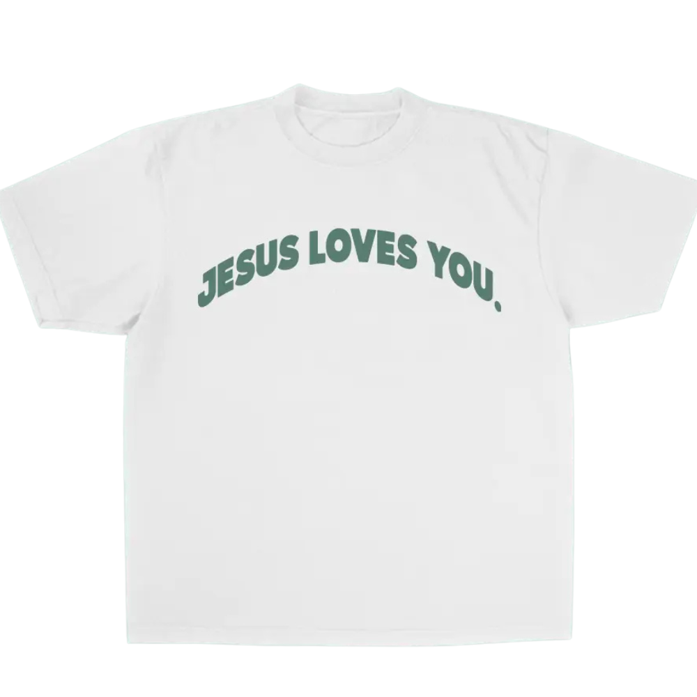 The front features a clean, understated “Jesus Loves You” message, offering a simple yet powerful expression of faith. On the back, the full design comes to life with “A New Heaven & New Earth” text surrounding a globe illustration accented with leaves and orbiting lines, symbolizing creation restored and made new. The scripture reference grounds the design in biblical truth while keeping it visually striking.