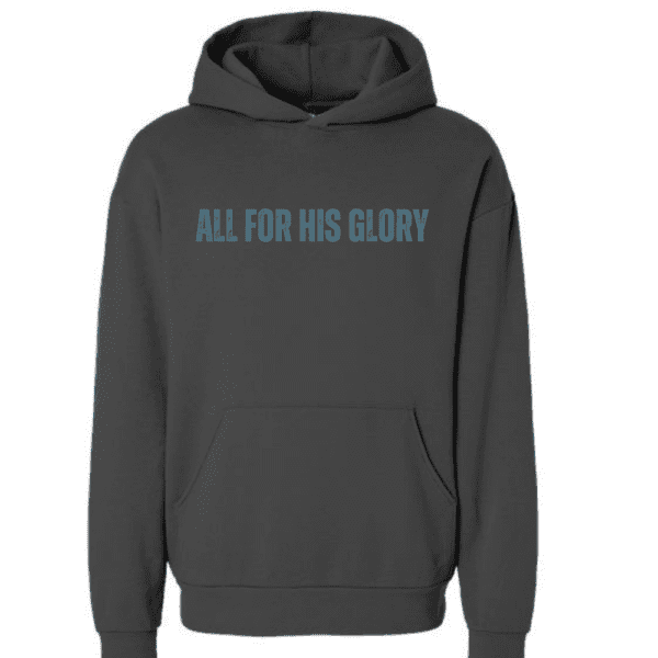 Dark gray hoodie with "All For His Glory" printed across the chestAll For His Glory Hooded Sweatshirt