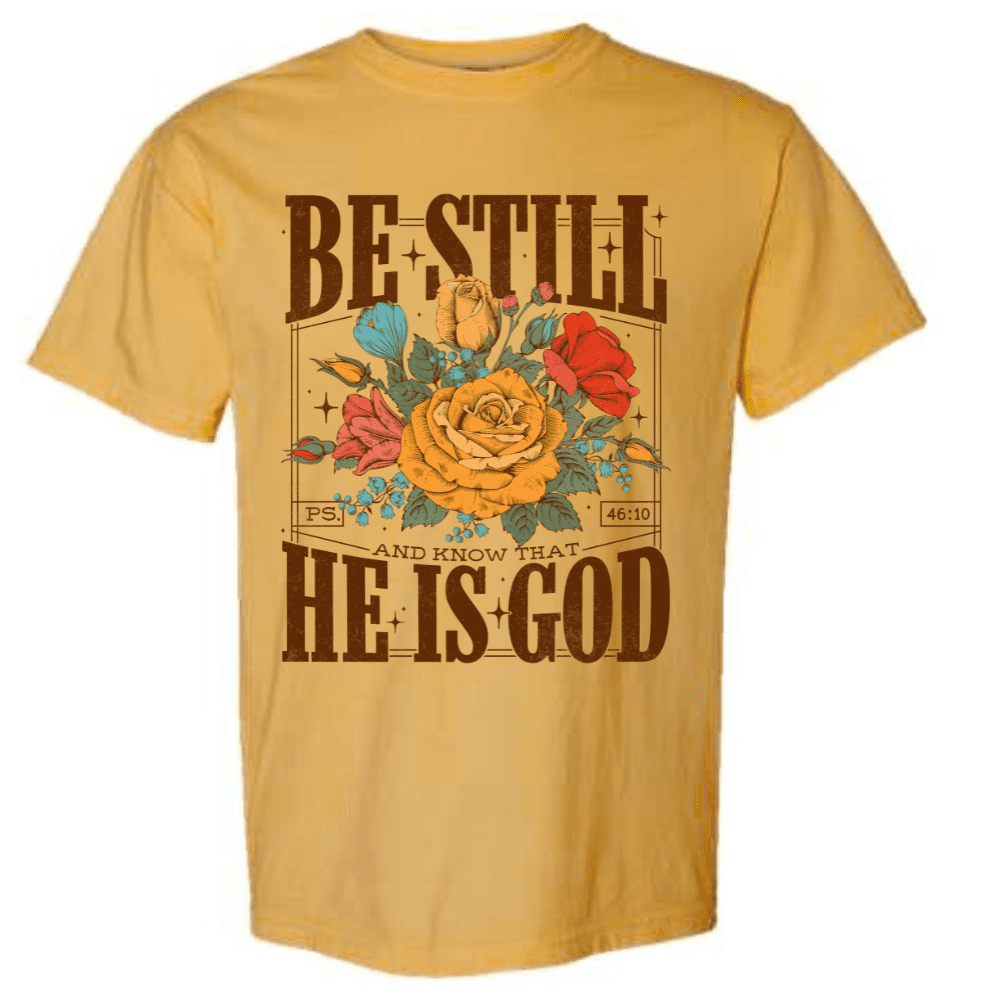Let peace settle over your day with the Be Still and Know T-Shirt, a soft cotton-poly blend tee inspired by Psalm 46:10 — “Be still and know that I am God.” This mustard yellow shirt features a bold vintage-style floral graphic, bursting with warm tones and rich symbolism that speak to God’s faithfulness and beauty.
