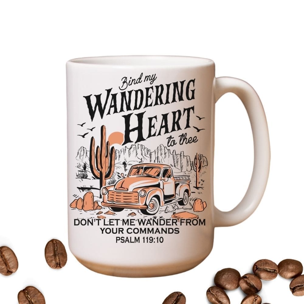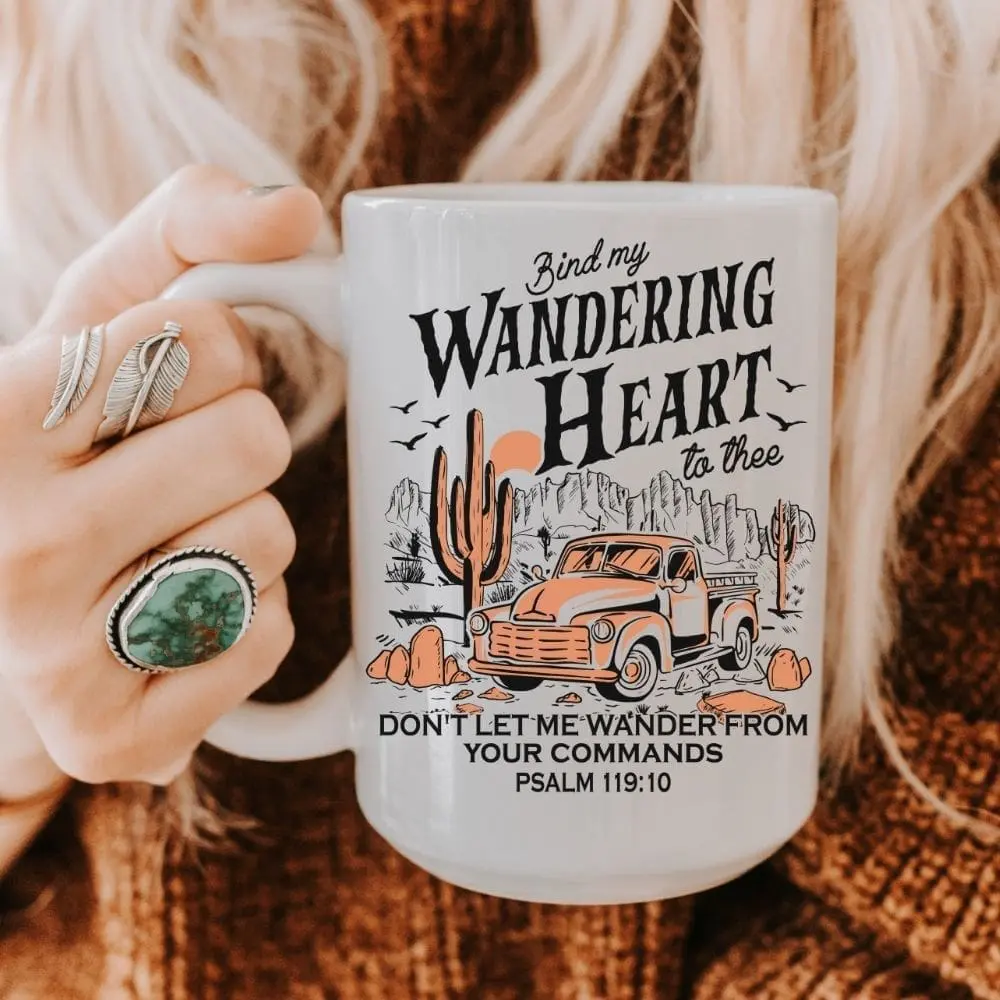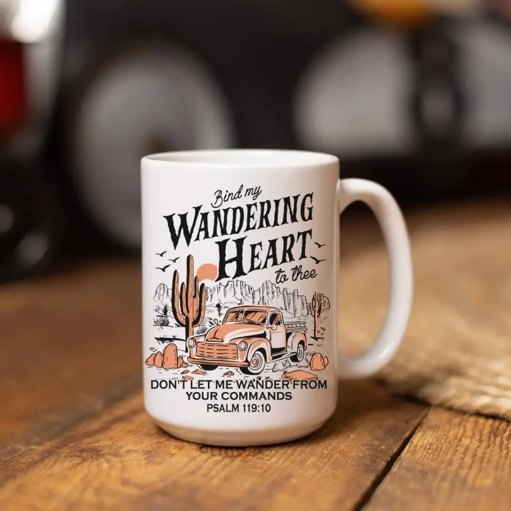 This 15oz ceramic mug features a line from the hymn “Come Thou Fount” and the verse Psalm 118:10, “Don’t let me wander from your commands.”