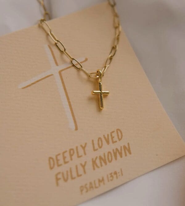 A timeless reminder of God’s intimate love and understanding, the Deeply Loved, Fully Known Necklace features a simple, elegant cross charm on a modern 14kt gold-plated mini paperclip chain. Inspired by Psalm 139:1 – “Lord, You have searched me and known me,” this necklace speaks to the truth that we are fully seen and still completely loved by our Creator.