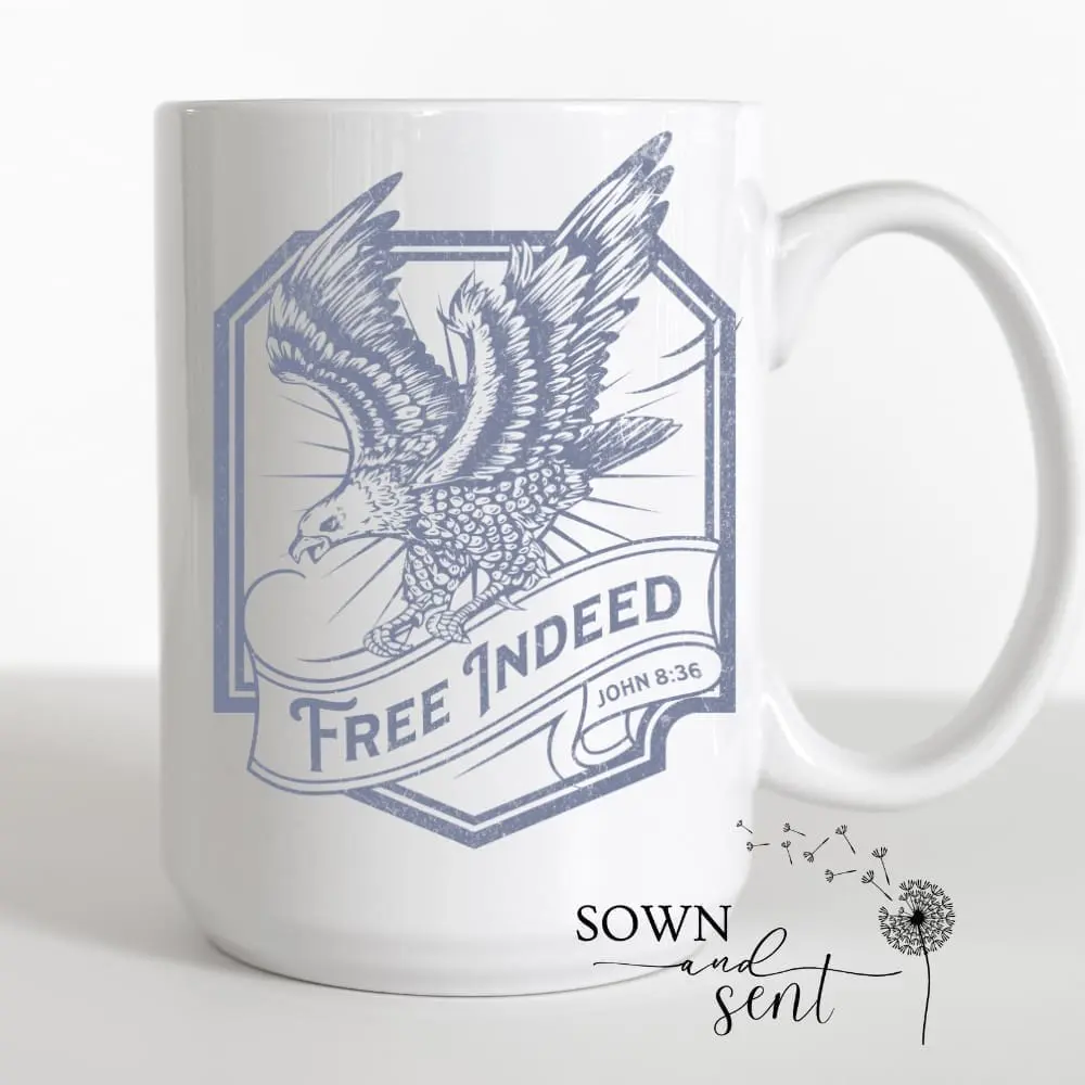 Perfect for the modern man or woman of faith or as a thoughtful gift for loved ones, our “Free Indeed” mug. Elevate your daily routine, declare your faith with boldness and conviction, and be inspired to embrace your freedom in Christ and soar to new heights of courage, strength, and purpose.