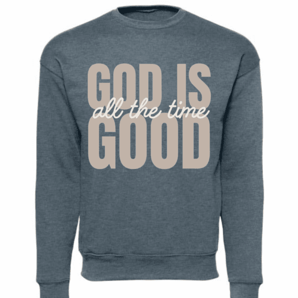 God Is Good All The Time sweatshirt with bold Christian lettering on a soft blue crewneckGod is Good All The Time Sweatshirt
