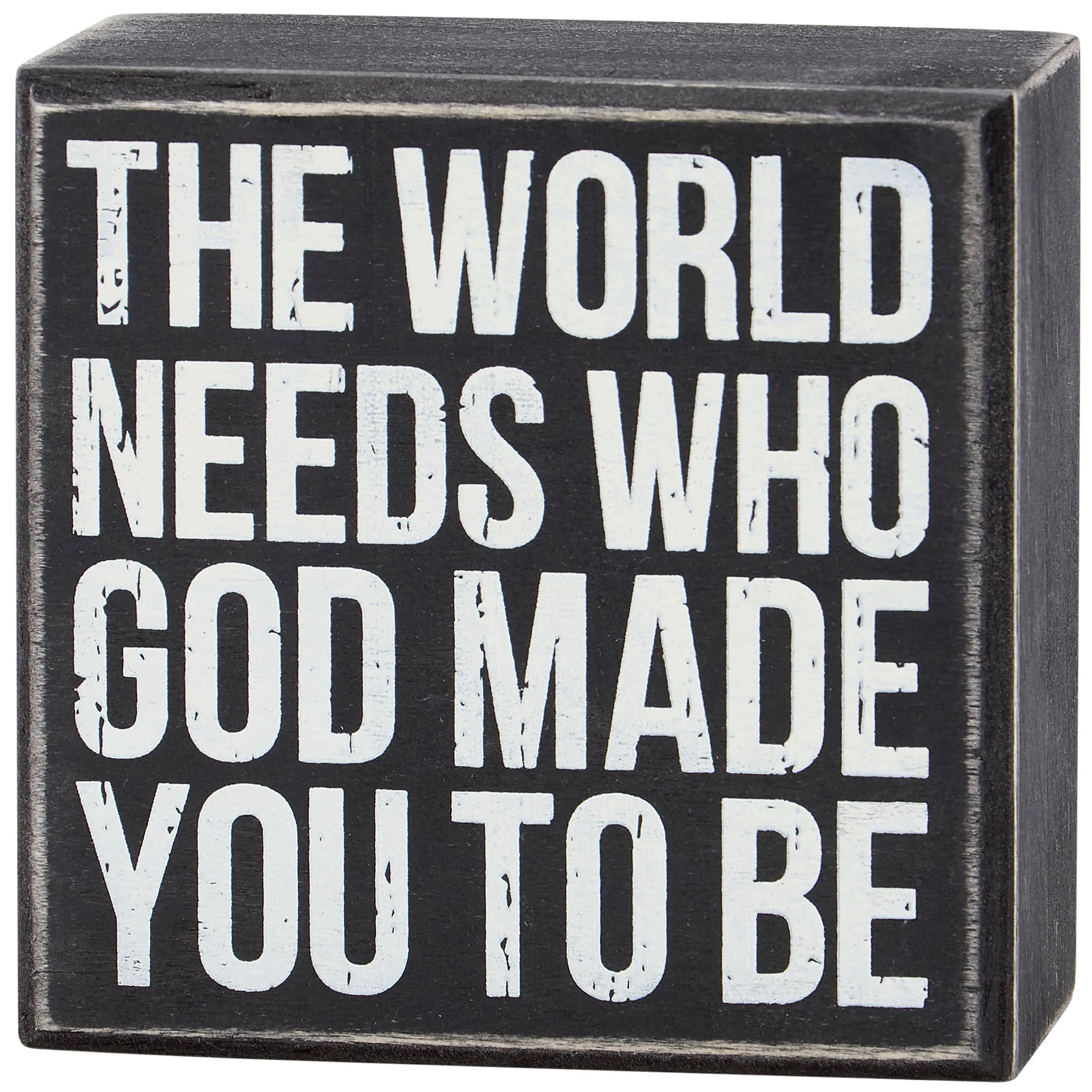 A classic black and white wooden box sign from our Box Sign Collection displaying an inspirational faith inspired sentiment that reads “The World Needs Who God Made You To Be.” Inspirational box sign features distressed details with coordinating black color on sides and back. Our God Made You To Be box sign is easy to hang or can free-stand alone. An inspirational gift that can be easily displayed in any home or work space.