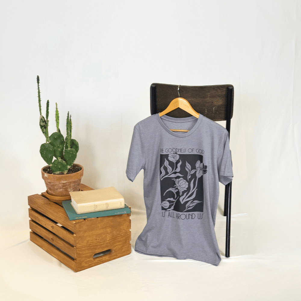 This women’s t-shirt pairs a clean, modern floral design with the thoughtful phrase “The Goodness of God is all around us.” Subtle and stylish, it’s perfect for everyday wear and a meaningful way to reflect your faith.