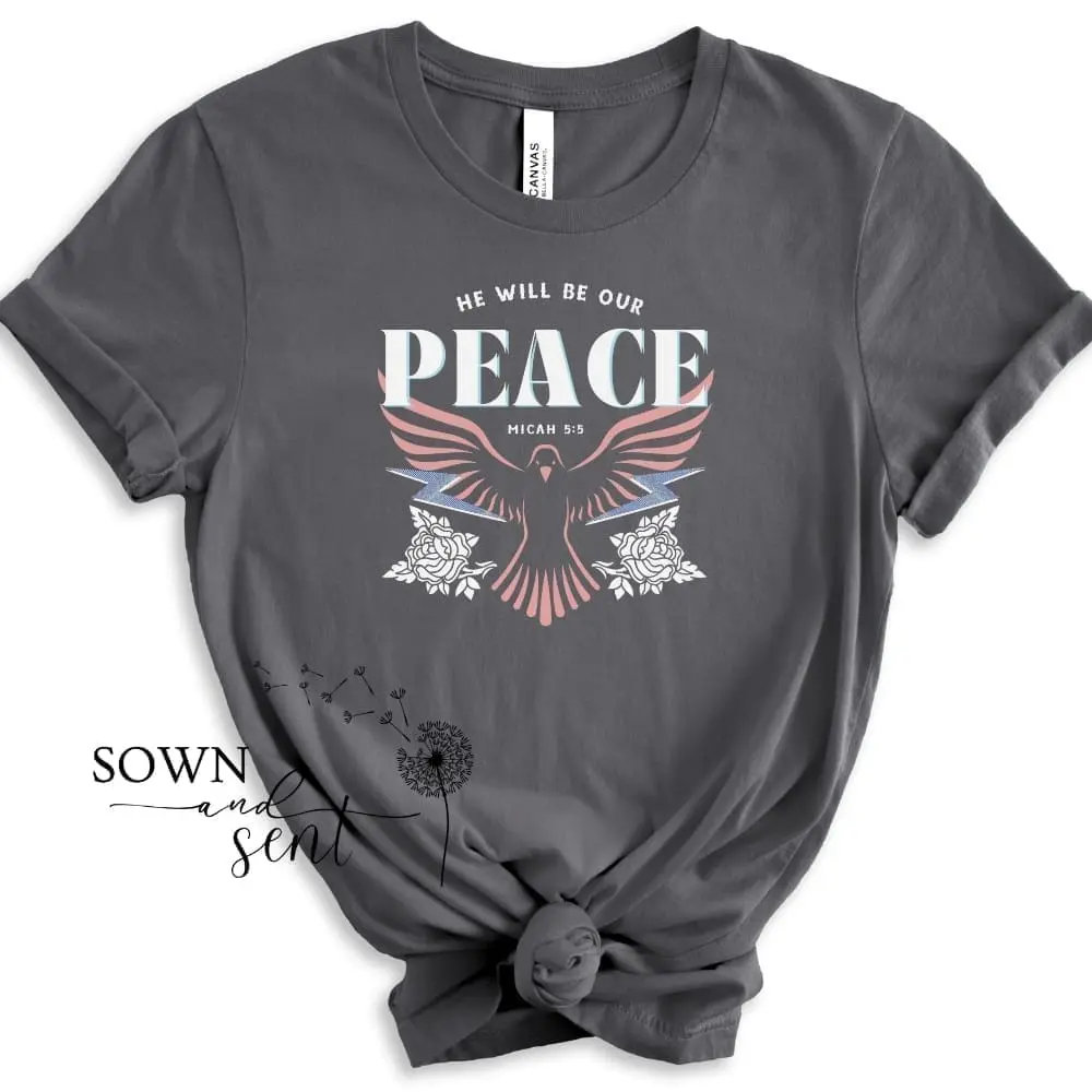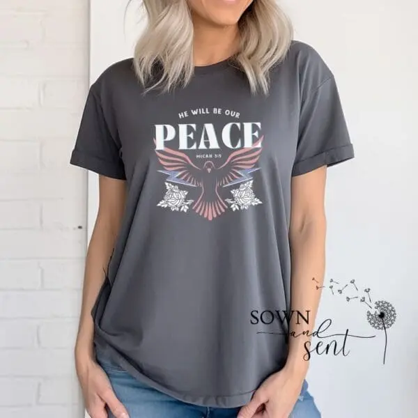 Inspired by Micah 5:5, this shirt serves as a powerful reminder of God’s promise to be our ultimate source of peace in times of turmoil and uncertainty.
