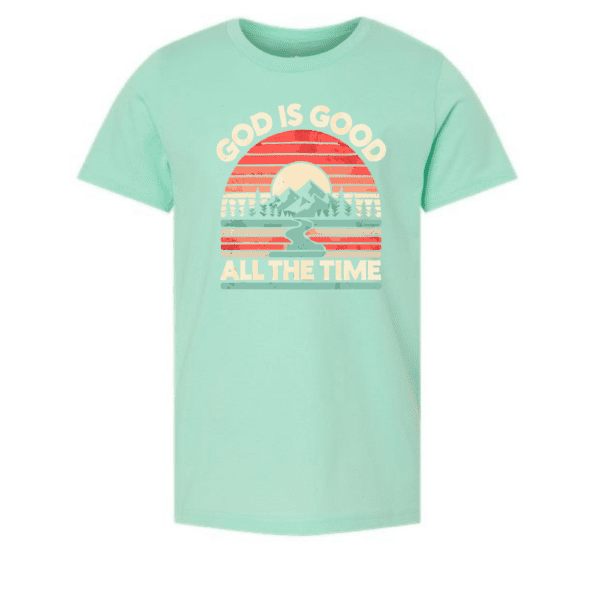 Speak truth and joy into every day with this mint green “God Is Good All The Time” tee for kids. Featuring a vintage-style graphic with a sunrise over the mountains and bold lettering, this shirt is a great way for children to carry a message of hope and faith wherever they go. Made from soft 100% cotton, it’s gentle on young skin and perfect for school, play, or church. A fresh color and meaningful design come together in a tee that’s sure to become a favorite.