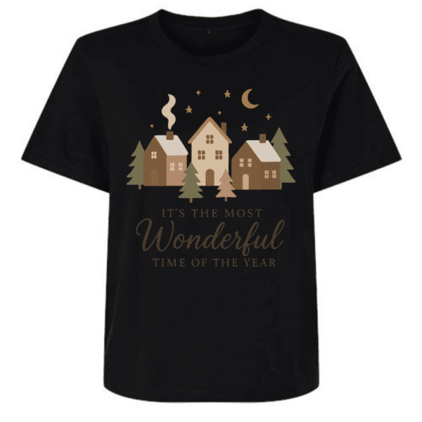 Celebrate the season in style with our Most Wonderful Time Cropped T-Shirt. This festive tee features a charming winter village design with warm, muted tones and the classic phrase “It’s the Most Wonderful Time of the Year.”