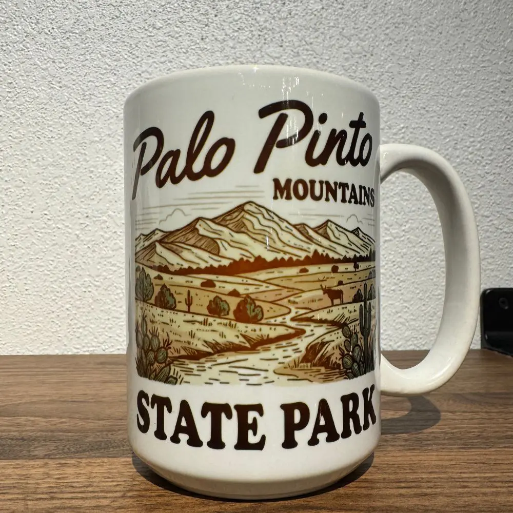 Celebrate the beauty of the future Palo Pinto Mountains State Park with this scenic 15oz ceramic mug. Designed for both adventure lovers and coffee enthusiasts, this mug features a vintage-inspired landscape illustration of rugged mountains, winding rivers, and cactus-dotted Texas terrain.