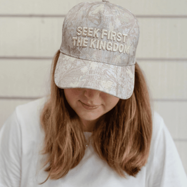 A subtle statement piece that carries a powerful message. The Seek First The Kingdom Hat features a soft, pastel camouflage pattern and bold cream embroidery that reads “SEEK FIRST THE KINGDOM.” Made for those who want their style to reflect their values, this hat is breathable, adjustable, and perfect for daily wear. Whether you’re running errands, spending time outdoors, or heading to Bible study, it’s a reminder to keep first things first.