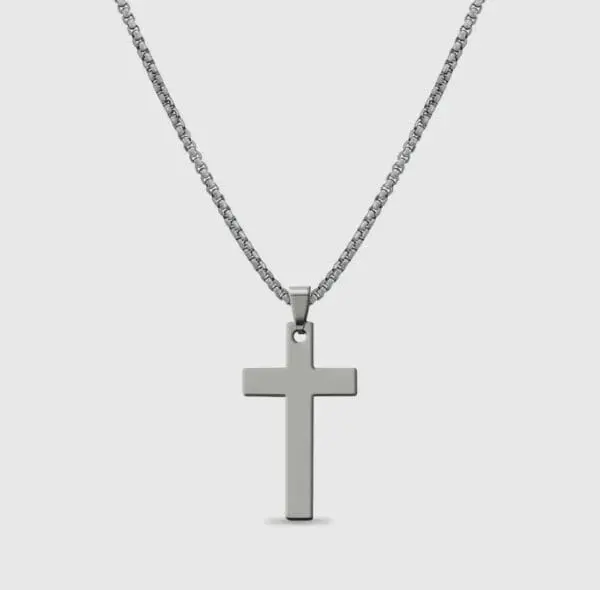 Stainless steel cross pendant on a 24 inch rounded box chain that creates a sleek, versatile finish with a masculine feel.