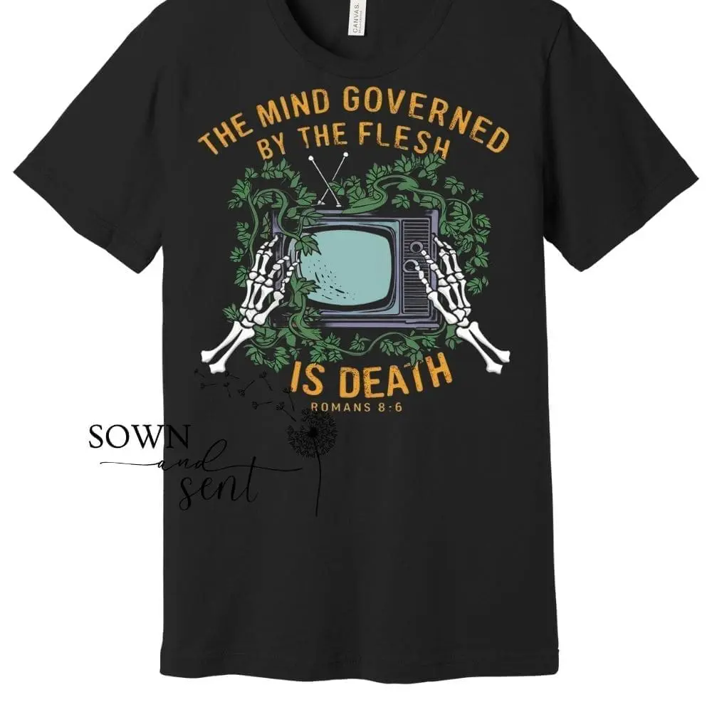 Elevate your streetwear game! Featuring a powerful message from Romans 8:6: “The Mind Governed By The Flesh is Death.” This trendy Christian tshirt is designed for the modern man who values faith, style, and substance.