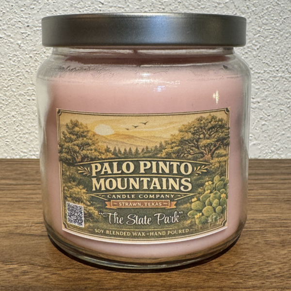 The State Park Candle by Palo Pinto Mountains Candle Company celebrates the long-awaited opening of Palo Pinto Mountains State Park in Strawn, Texas. This 16oz soy blend candle is hand poured locally and designed to reflect the beauty, adventure, and wide-open spirit of the Palo Pinto Mountains.