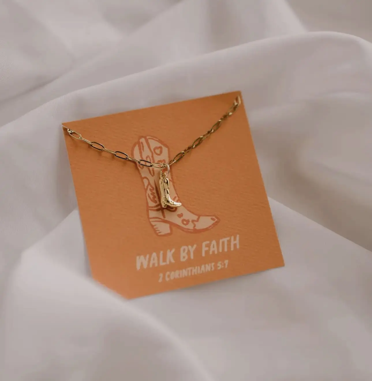 Walk By Faith Boot Charm Necklace – Christian Jewelry Inspired by 2 Corinthians 5:7