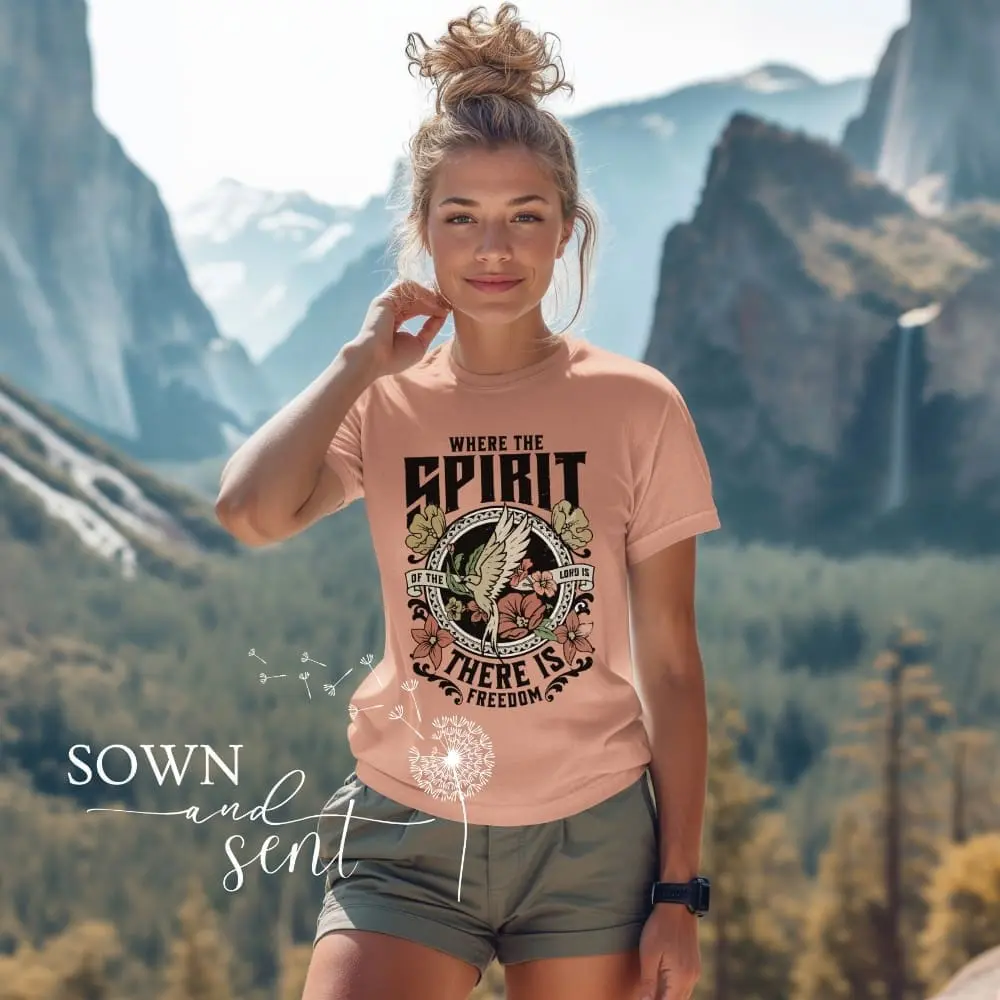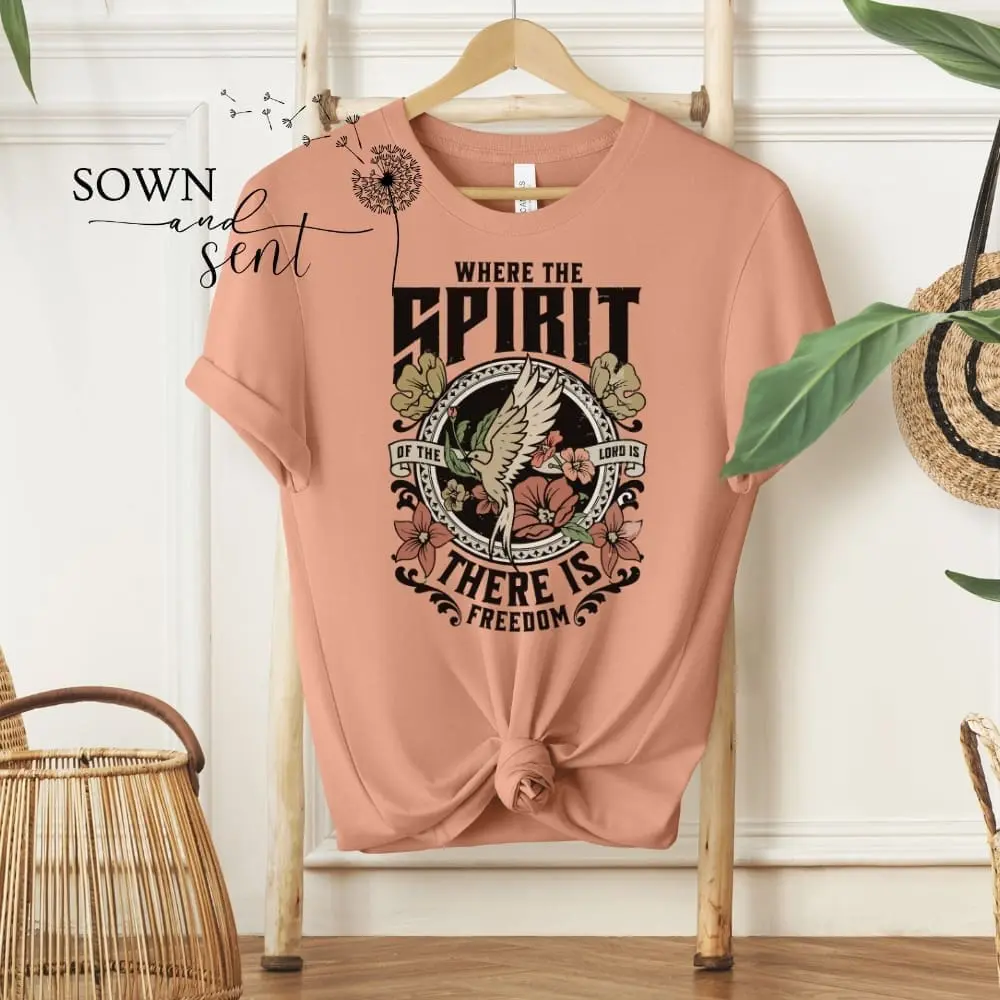 Introducing our empowering “Where The Spirit of The Lord is” T-Shirt, boldly declaring the words of 2 Corinthians 3:17, “Where the spirit of the Lord is, there is freedom.” Crafted for those who seek to embrace faith and liberation in their daily lives, this shirt serves as a powerful reminder of the boundless freedom found in the presence of the Lord. Those who are in Christ Jesus have been set free from the power of sin, from death, and the fear of darkness. We are empowered by the Holy Spirit to be transformed into the likeness of Christ.